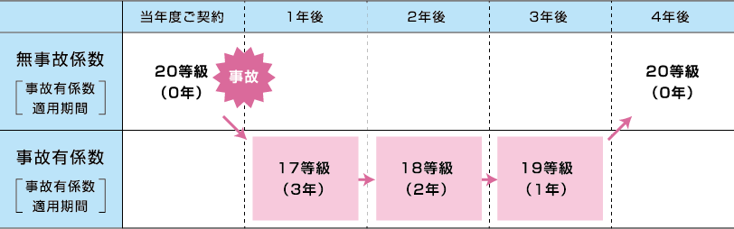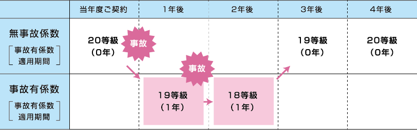 「事故有係数適用期間」は、「3等級ダウン事故」1件につき3年、「1等級ダウン事故」1件につき1年となり、年数は積算されます。(上限6年、下限は0年となります。)